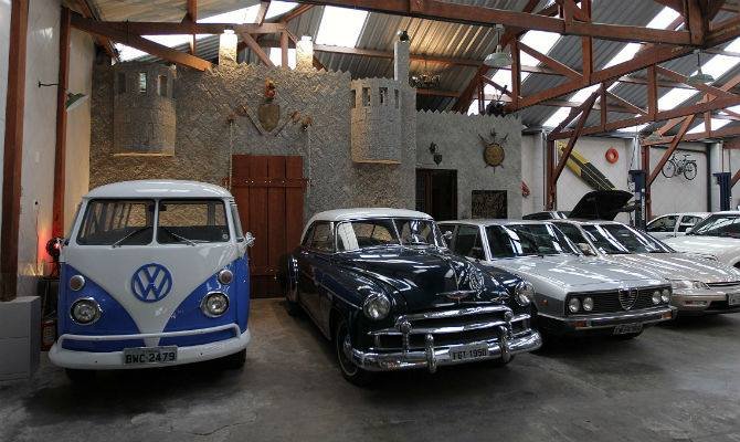 Uma oficina com mais de 23 anos de história, em uma vila com arquitetura de castelo, piso de paralelepípedo e um acervo de mais de 38 carros clássicos.